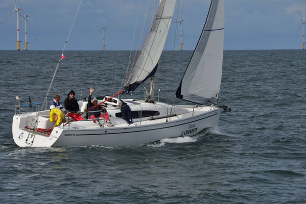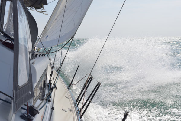 Mardi, départ pour le Crouesty dès 8h par précaution, un BMS est pour le soir. Très bonnes conditions pour ce retour avec un vent régulier de 12-15 kns sud-sud-est. Quelques marsouins nous ont accompagné au large de d'Hoedic.